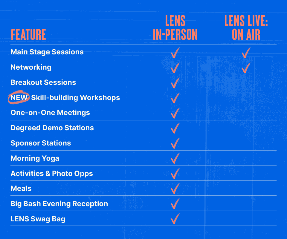 We’re offering a reduced, real-time, virtual stream of LENS content. Sessions presented on the main stage will be live-streamed in Central Time (GMT-6) on March 5 and 6. You can find these sessions listed in blue on the Agenda page.